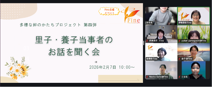 2024年、Fineの内部に立ち上がった「多様な絆のかたちプロジェクト」では、里親や養子縁組について、不妊当事者が理解を深めるための企画を実施してきました。前回の第三弾では里親と養親の方の体験談をお聞きし、今回は第四弾として、里子・養子として育った子どもの立場からの体験談をお聞きしました。里子当事者の小春さんと、特別養子縁組の養子当事者であるみそぎさんのお二人をゲストにお招きし、体験談をお話しいただき、最後に質疑応答という形で会を進行しました。